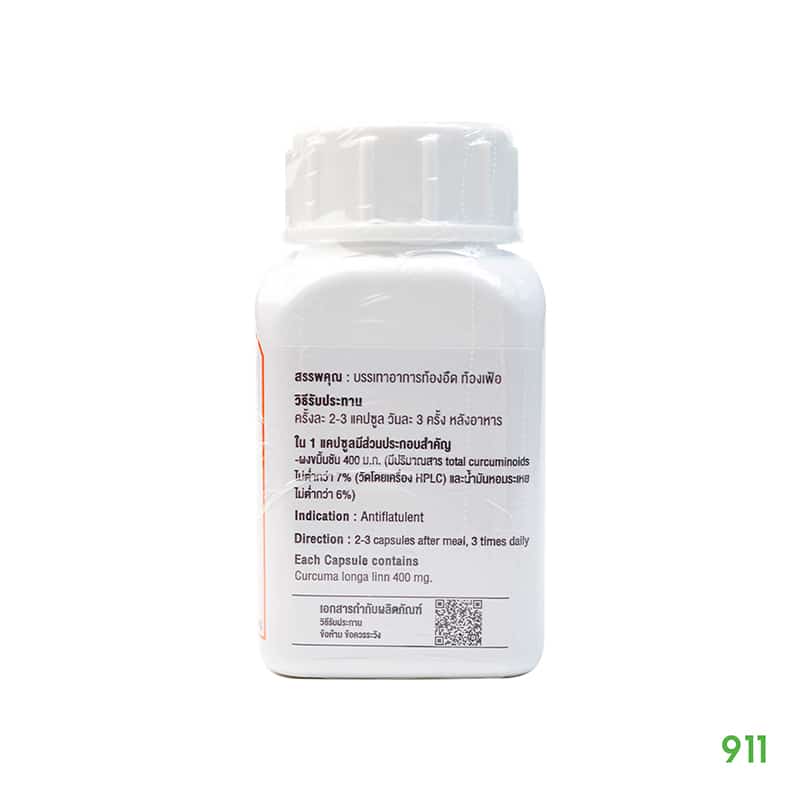 - ผงขมิ้นชัน 400 มก. (มีปริมาณสาร total curcuminoids ไม่ต่ำกว่า 7% (วัดโดยเครื่อง HPLC) และน้ำมันหอมระเหย ไม่ต่ำกว่า 6%)