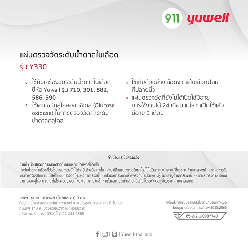 • ใช้กับเครื่องวัดระดับน้ำตาลในเลือดยี่ห้อ Yuwell รุ่น 710, 301, 582, 586, 590